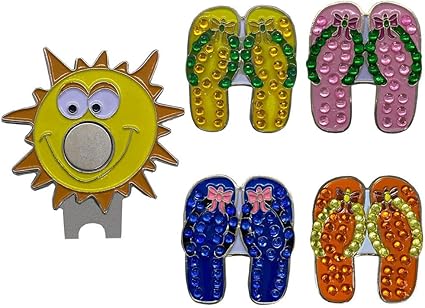 Details: Giggle Golf Beach Ball Marker Pack Two | Includes One Yellow, One Pink, One Blue, and One Orange Flip Flops Bling Ball Marker