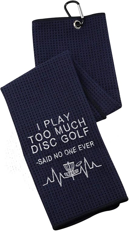 - Towel with saying: I Play Too Much Disc Golf, Said No One Ever. The essential companion for any golf outing.